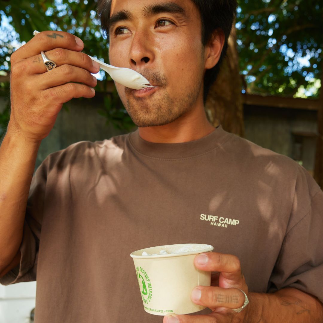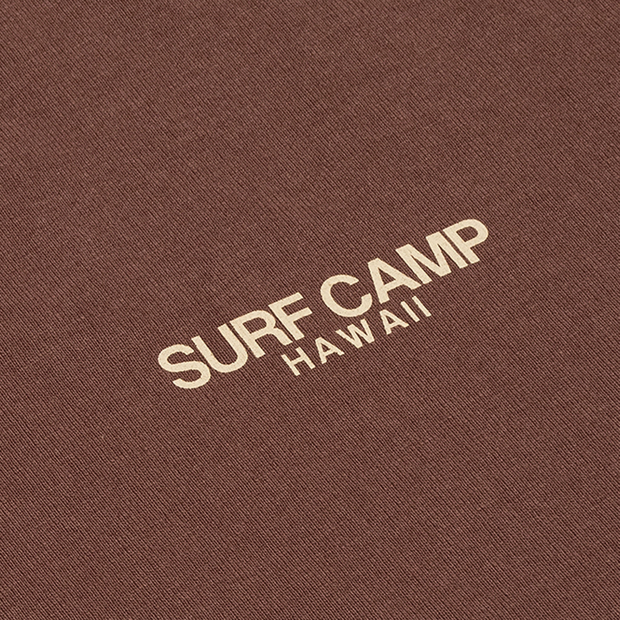 The Micro Logo Tee in Chocolate is a boxy, garment-dyed tee made in Hawaii. It features a small Surf Camp Hawaii logo on the left chest, hand-printed with water-based ink for a soft, vintage feel.